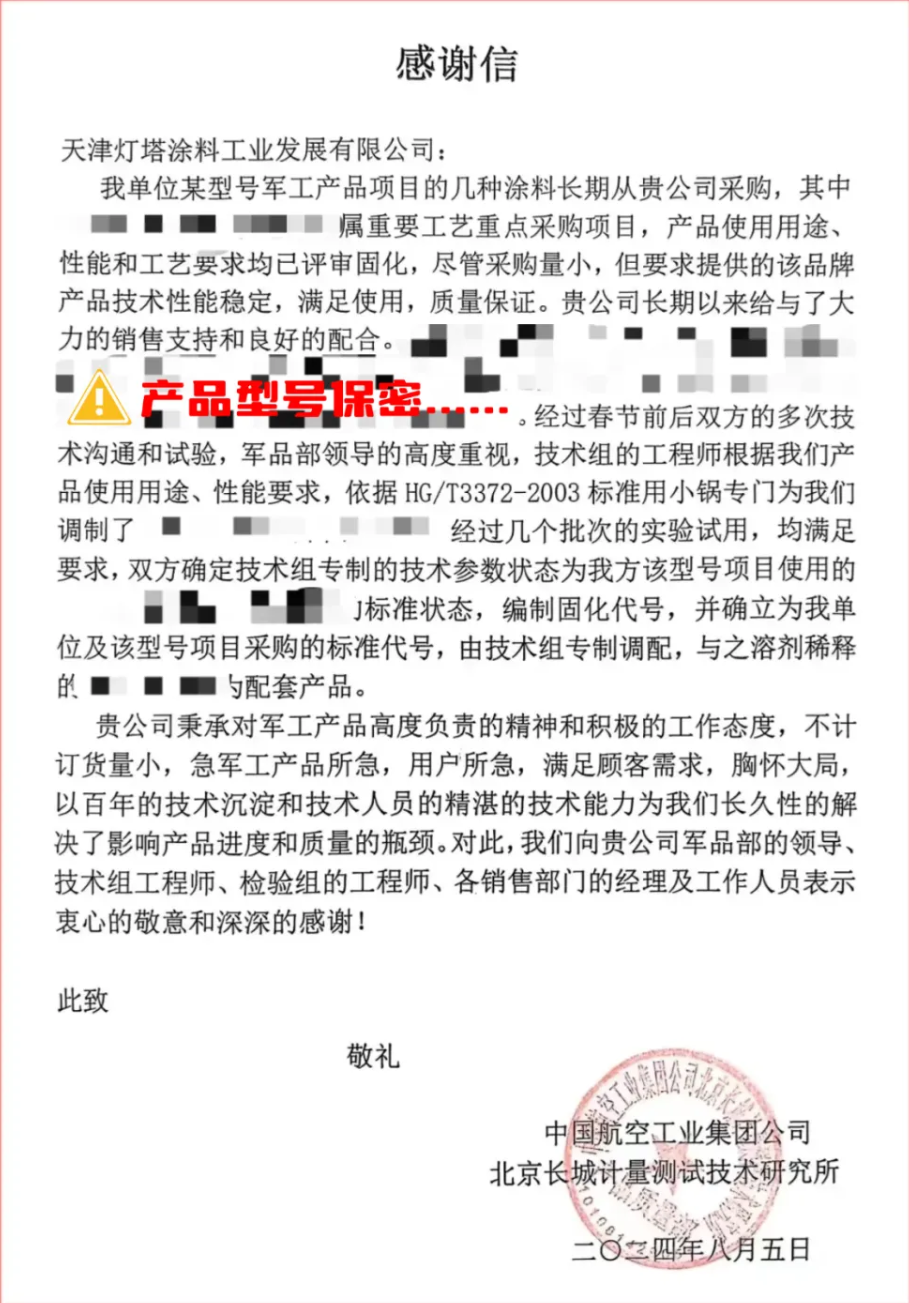 近日,北新燈塔收到了中國航空工業(yè)集團公司北京長城計量測試技術研究所的感謝信,信中對北新燈塔在涂料供應中的專業(yè)表現和技術支持表示了認可和感激。金杯、銀杯,不如客戶的口碑!客戶的認可是我們的最高榮譽!感謝中國航空工業(yè)集團公司及其所屬企業(yè)長期以來對燈塔涂料的大力支持和高度認可!作為軍工產品涂料的供應商,我們深知每一份信任的重量。供貨以來,燈塔團隊以積極飽滿的服務態(tài)度,克服了環(huán)境、疫情等重重困難,最大程度...