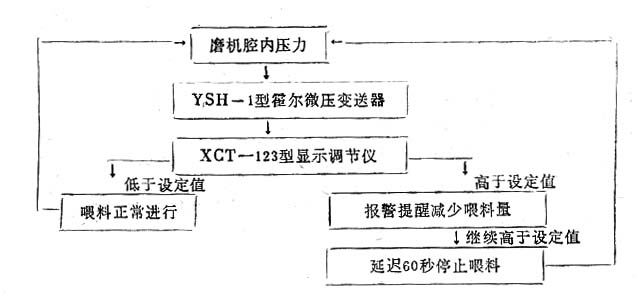 立磨機的飽磨主要是由以下幾方面的原因造成的:①喂料量太大;②排風(fēng)量太少;③選粉機故障。一旦磨機發(fā)生飽磨現(xiàn)象,電機將處于過載運行狀態(tài),所以必須設(shè)置保護裝置,以免燒壞電機。某些國產(chǎn)立磨機沒有飽磨保護裝置。對此問題同力重機建議可以采取了下面的保護措施:在磨腔側(cè)開一測壓孔,測量磨內(nèi)的負(fù)壓,根據(jù)磨腔內(nèi)負(fù)壓與物料多少成一定比例關(guān)系的原理,將此負(fù)壓通過一個YSH—1型霍爾微壓變送器轉(zhuǎn)換成毫伏信號,再將此信號輸入到一個XCT—123型的顯示調(diào)節(jié)儀中,當(dāng)磨內(nèi)負(fù)壓達到上限設(shè)定值(此值由實際測取,磨機型號不同此值不同)時,顯示調(diào)節(jié)儀中的繼電器接點動作,發(fā)出報警信號,提醒操作工減少喂料量。如果負(fù)壓繼續(xù)超過設(shè)定值延時60秒后,控制喂料器停止喂料,待磨內(nèi)負(fù)壓低于設(shè)定值時,喂料器又重新開始正常喂料。其原理如圖1所示。