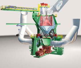 礦渣立磨設(shè)備工作原理介紹:礦渣立磨機原礦渣經(jīng)抓斗機進入喂料倉,計量后由輸送皮帶送入螺旋喂料裝置喂入ZJTL輥式立磨機,在磨內(nèi)物料隨磨盤旋轉(zhuǎn)在離心力的作用下從中心向邊緣移動,經(jīng)過壓實、脫氣、粉磨過程后,物料在磨盤邊緣被從風(fēng)環(huán)進入的熱風(fēng)帶起,并瞬間烘干,較細顆粒被帶到選粉機進行分選,粗粉返回磨盤再粉磨。合格細粉被帶入袋式收塵器,進行成品收集后氣粉分離。成品收集后經(jīng)輸送進入成品散裝庫,廢氣經(jīng)風(fēng)機消音后排出。部分難磨的大顆粒物料(及鐵瘤子、鐵渣)在風(fēng)環(huán)處通過吐渣口進入外循環(huán)系統(tǒng),經(jīng)除鐵后再次由提升機喂入磨內(nèi)粉磨。磨機烘干和通風(fēng)需要的熱空氣由熱風(fēng)爐提供,不足部分由冷風(fēng)閥從大氣中補充。系統(tǒng)風(fēng)量大烘干能力強,入磨物料水分可達8-15%.