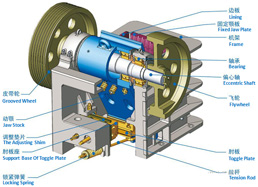 鄂式破碎機(jī)工作時(shí),活動(dòng)鄂板對(duì)固定鄂板作周期性的往復(fù)運(yùn)動(dòng),時(shí)而靠近,時(shí)而離開。當(dāng)靠近時(shí),物料在兩鄂板間受到擠壓、劈裂、沖擊而被破碎;當(dāng)離開時(shí),已被破碎的物料靠重力作用而從排料口排出。