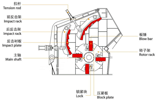 反擊式破碎機是一種利用沖擊能來破碎物料的破碎機械。機器工作時,在電動機的帶動下,轉(zhuǎn)子高速旋轉(zhuǎn),物料進入板錘作用區(qū)時,與轉(zhuǎn)子上的板錘撞擊破碎,后又被拋向反擊裝置上再次破碎,然后又從反擊襯板上彈回到板錘作用區(qū)重新破碎,此過程重復(fù)進行,物料由大到小進入一、二、三反擊腔重復(fù)進行破碎,直到物料被破碎至所需粒度,由出料口排出